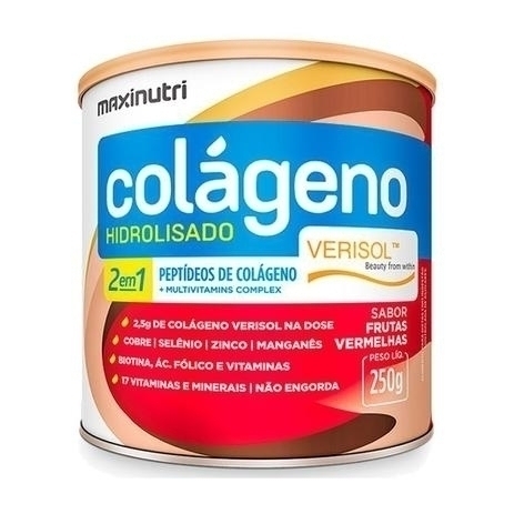 Colágeno Hidrolisado 2 em 1 VERISOL (250g) - Maxinutri     O Colágeno Hidrolisado 2 em 1 VERISOL da Maxinutri colabora para prevenção do envelhecimento celular, manter a pele mais firme, diminui celulites e também no fortalecimento das unhas, articulações, cabelos e hidratação da pele e dos intestinos.      O colágeno deixa de ser produzido gradativamente à partir dos 30 anos, portanto sua suplementação se faz necessária para manter uma aparência mais jovem e com menos flacidez tecidual. Com o colágeno O Colágeno Hidrolisado 2 em 1 VERISOL você vai experimentar a sensação de uma pele mais jovem e um corpo mais firme.   Benefícios:* Garante maior coesão dos tecidos da pele;* Garante cabelos e unhas com maior força e brilho;* Fortalece as articulações;* Diminui as rugas;* Está relacionado com a prevenção do envelhecimento;