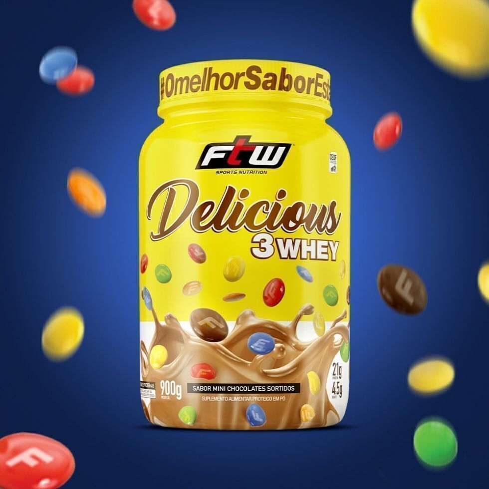Delicious 3Whey (900g)     O Delicious 3Whey FTW apresenta variedade e praticidade em um só produto. Praticantes de atividade física ou quem busca uma rotina alimentar com bons nutrientes se beneficia do uso das proteínas do soro do leite, que fornecem qualidade nutricional com alto valor biológico. Contém grande concentração de proteínas e aminoácidos (rico em Bcaas e Glutamina) que são essenciais para os processos de ganho, recuperação e manutenção muscular.   Ideal para auxiliar a obter um resultado, o Delicious 3Whey FTW é uma fonte de proteína que ajuda na formação dos músculos e ossos. Sua fórmula foi especialmente elaborada e possui sabores exclusivos que só a FTW tem.  Benefícios: - Proteína de alto valor biológico;- Grande concentração de BCAA’s e glutamina;- Auxilia na recuperação e ganho de massa muscular;- Inibe o catabolismo devido á alta concentração de BCAA’s.